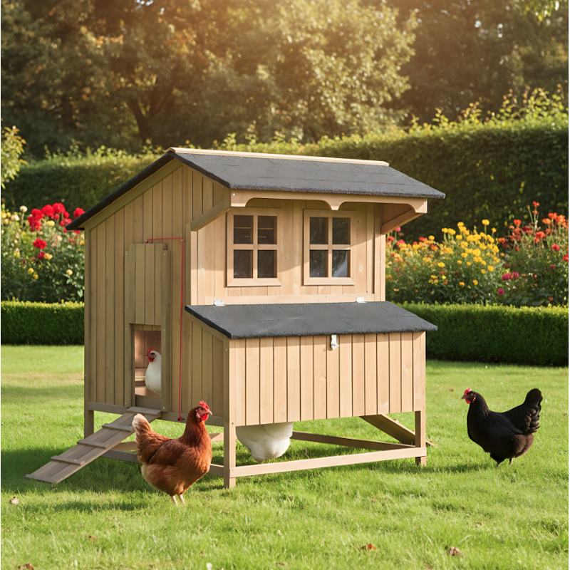 På siden er der en dør med snøre og under den er der en rampe for at give dine kyllinger fri passage ud og ind af hønsehuset. Hønsegården er lavet af vejrbestandigt materiale og står på træfødder med gummihætter for at forhindre for tidlig forrådnelse nedefra og for at beskytte dine høns mod kulden.