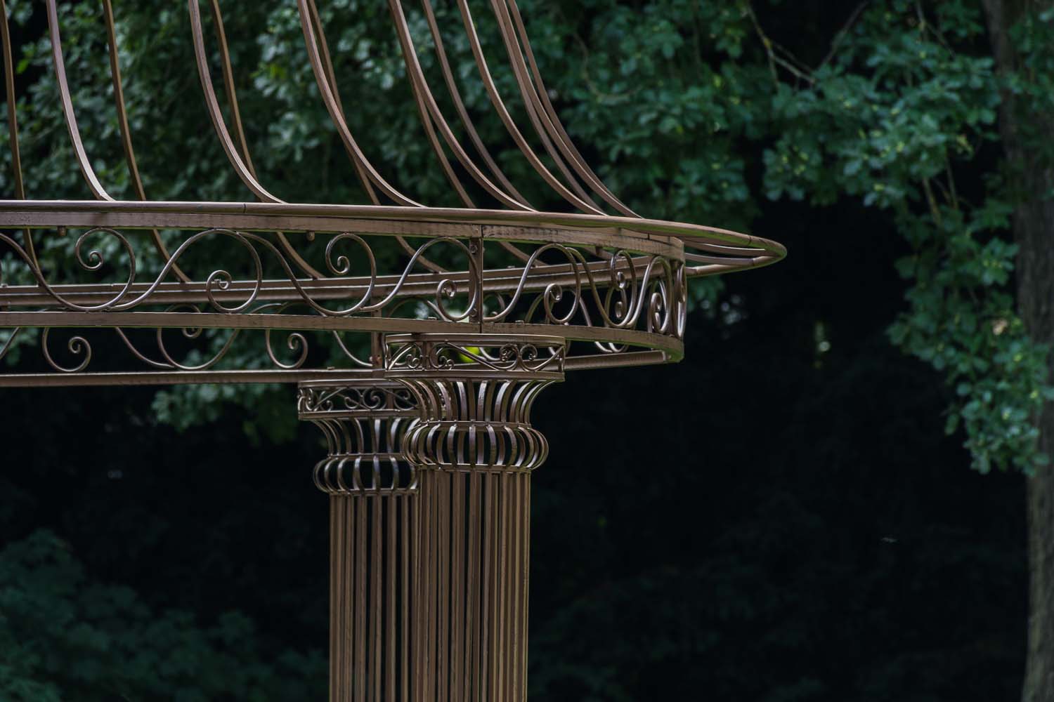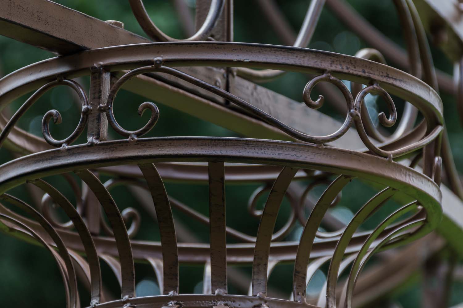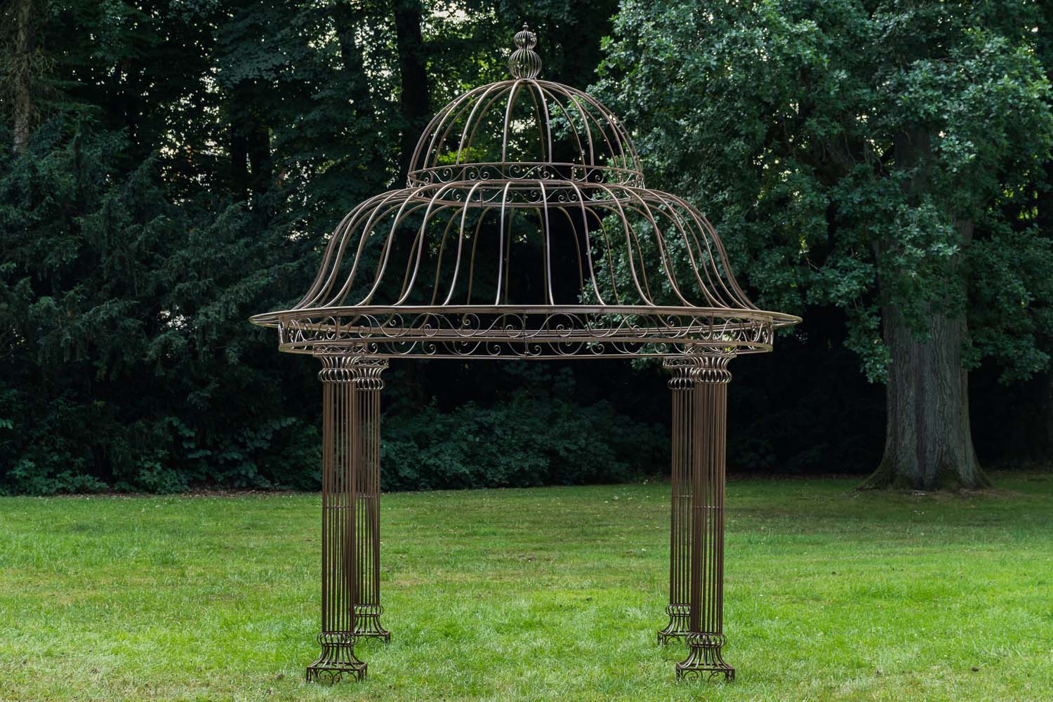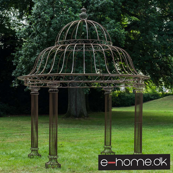 Den rummelige klatrepavillon har et kuppellignende, håndsmedet tag, der understøttes af fire stabile søjler. Den massive jernramme sikrer stabilitet og er afsluttet med en rustik patina i antik stil. Fittings og skrueforbindelser er lavet af stabilt metal. Den store pavillon er velegnet til klatring af planter fx roser eller vinblade, som er med til at trylle et hyggeligt sted frem i din have.