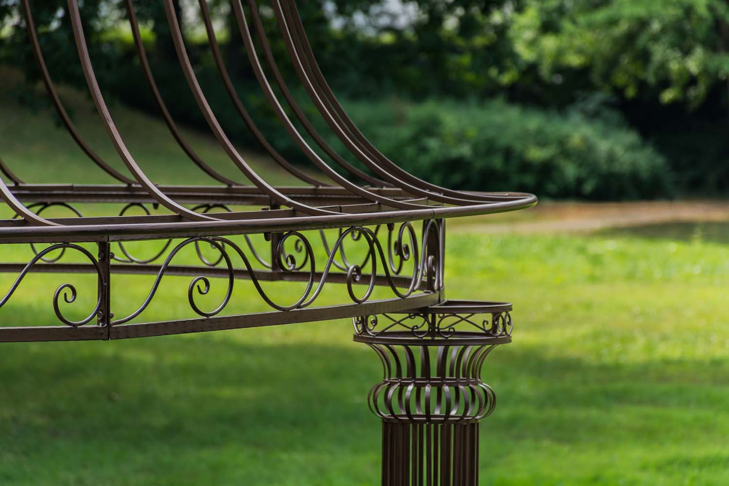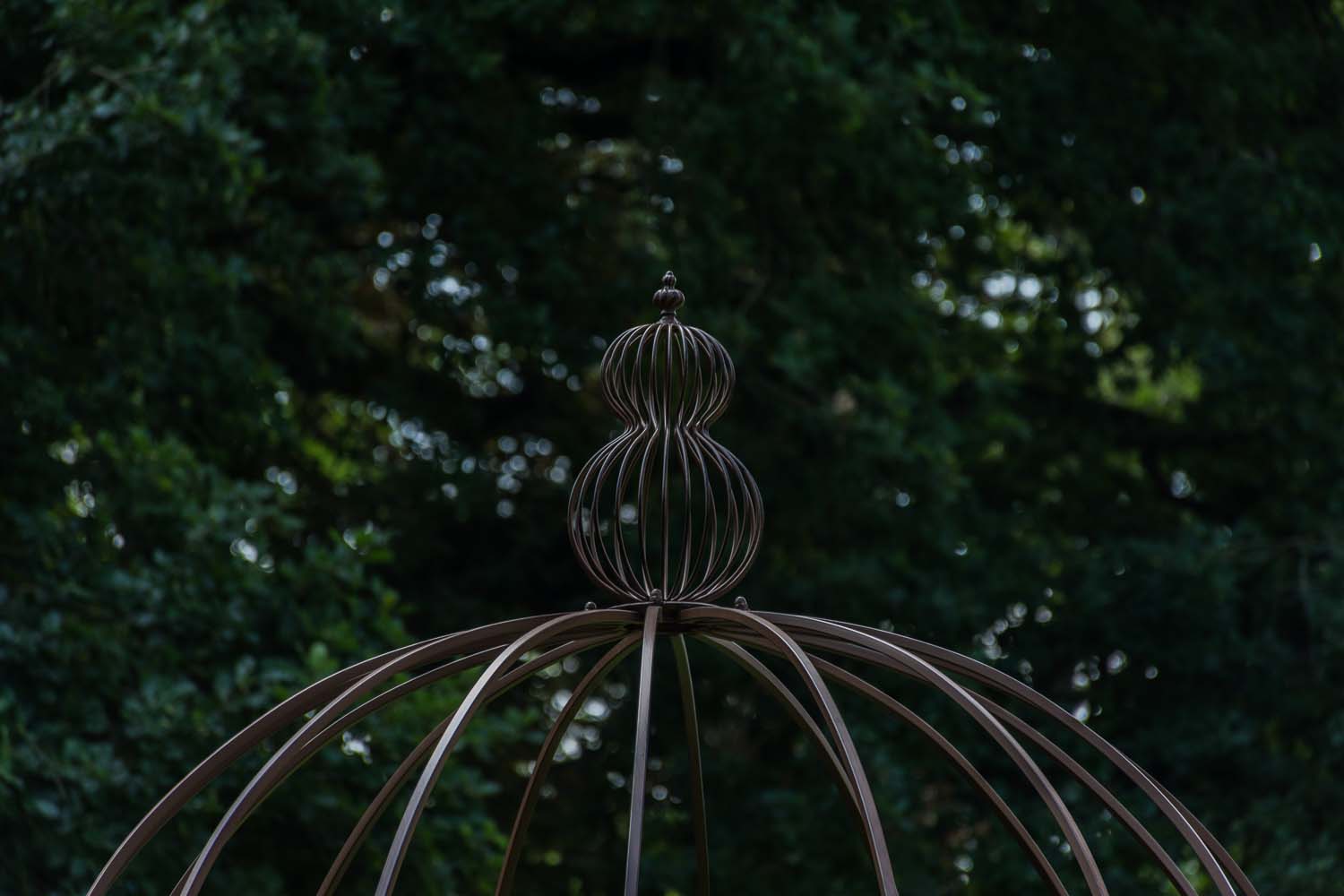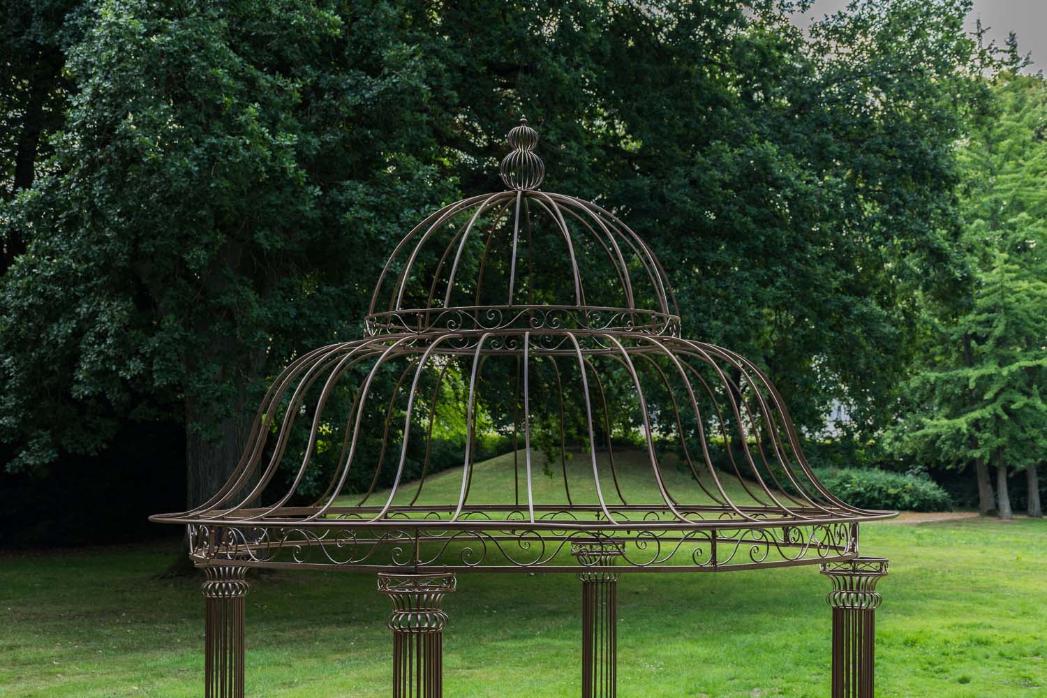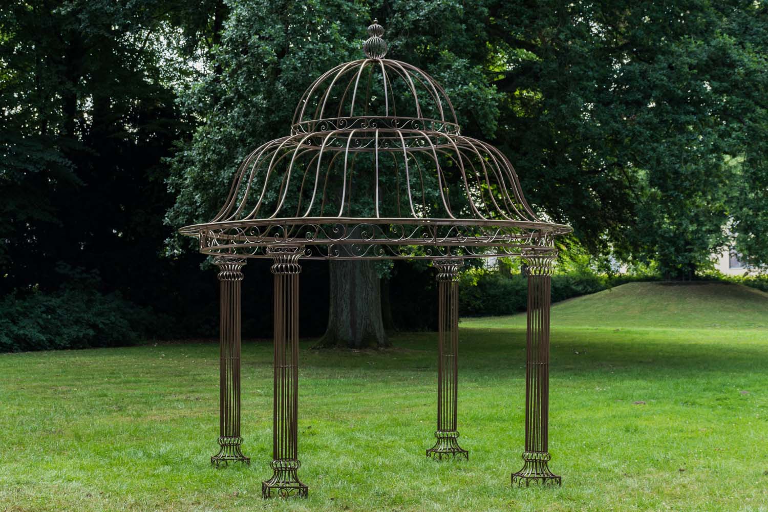 Den rummelige klatrepavillon har et kuppellignende, håndsmedet tag, der understøttes af fire stabile søjler. Den massive jernramme sikrer stabilitet og er afsluttet med en rustik patina i antik stil. Fittings og skrueforbindelser er lavet af stabilt metal. Den store pavillon er velegnet til klatring af planter fx roser eller vinblade, som er med til at trylle et hyggeligt sted frem i din have.