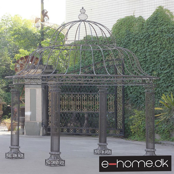 Den rummelige klatrepavillon har et kuppellignende, håndsmedet tag, der understøttes af fire stabile søjler. Den massive jernramme sikrer stabilitet og er afsluttet med en rustik patina i antik stil. Fittings og skrueforbindelser er lavet af stabilt metal. Den store pavillon er velegnet til klatring af planter fx roser eller vinblade, som er med til at trylle et hyggeligt sted frem i din have.
