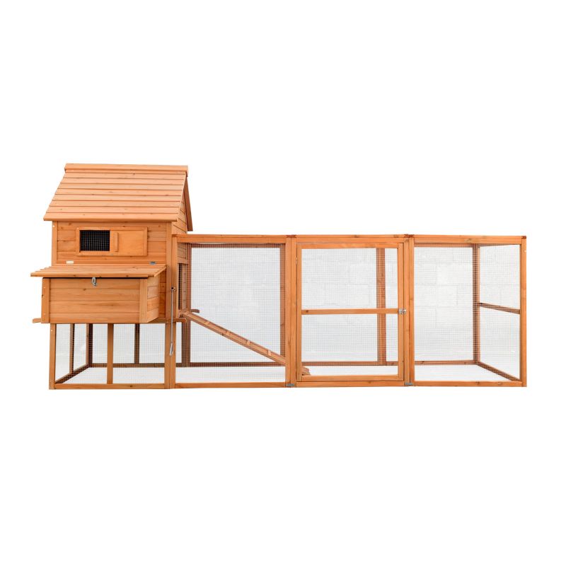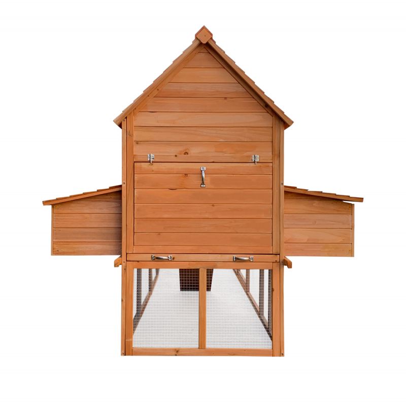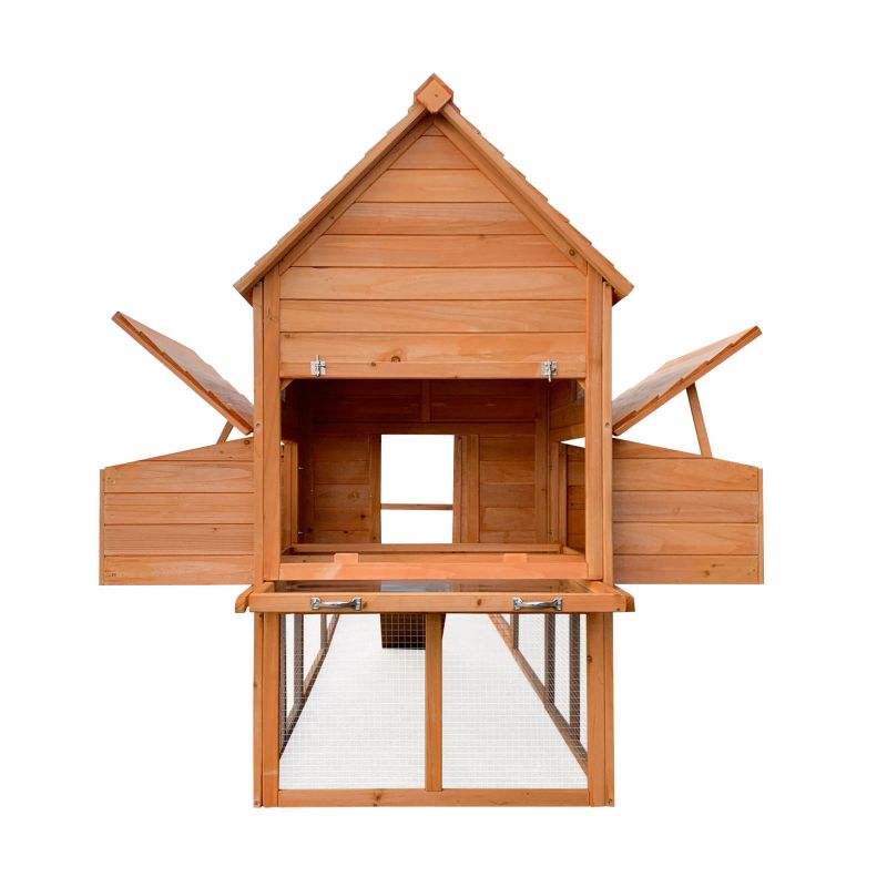 Hønsehuset har udvendige mål på 310 x 150 x 150 cm og består af to sammenhængende områder. Huset er placeret på en anden etage, som nås via en rampe, hvilket bevarer hele bunden af løbegården intakt. På siderne af huset er der to store redekasser, som begge har et låg, der kan åbnes. Dette gør det nemt at få adgang til indersiden, så du kan tjekke redekasserne eller tage et morgen æg. Under huset er der en galvaniseret bakke, som kan trækkes ud, hvilket gør det nemt at rengøre bunden af huset.
