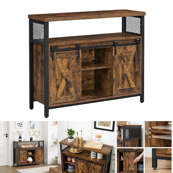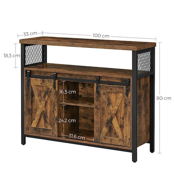 Stilfuldt og praktisk: Rustikke spånplader, stilfulde gitre og rustikke stalddøre – alt dette for en behagelig atmosfære. God stil og høj funktionalitet betyder ikke, at den behøver at mangle holdbarhed – Med en robust stålramme og højkvalitets spånplader holder dette skab nemt din kaffemaskine, blender og tallerkener.