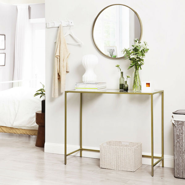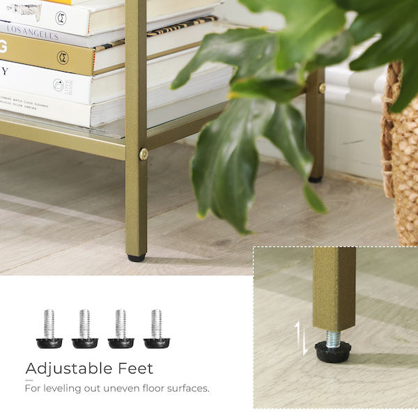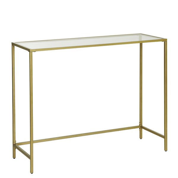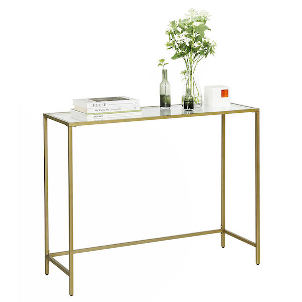 Tag dit hjem til et helt nyt niveau med dette moderne konsolbord. Den gyldne metalramme og den hærdede glas overflade udgør et minimalistisk og praktisk konsolbord. Det 6 mm tykke hærdede glas panel sidder solidt på den robuste metalramme på dette konsolbord, som desuden kan belastes med op til 30 kg og er derfor perfekt til bøger, dekorationer eller potteplanter. I stuen som sofabord, i dit køkken som en moderne skænk eller i din entre som et smukt konsolbord, dette møbel kan placeres lige dér, hvor det giver mening for dig.