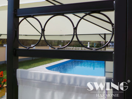 Den pulverlakerede ramme er prydet med fine ornamenter, der giver pavillonen et eksklusivt design.