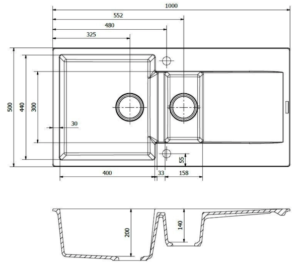 - Kummedybde: 200 mm / 140 mm