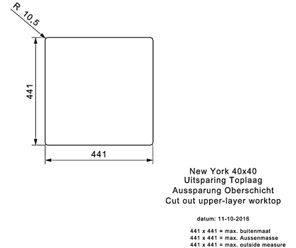 - Udskæringsmål planlimning / forsænket toplag (B x D): 441 x 441 mm.