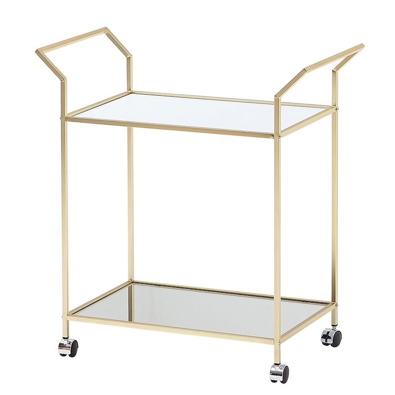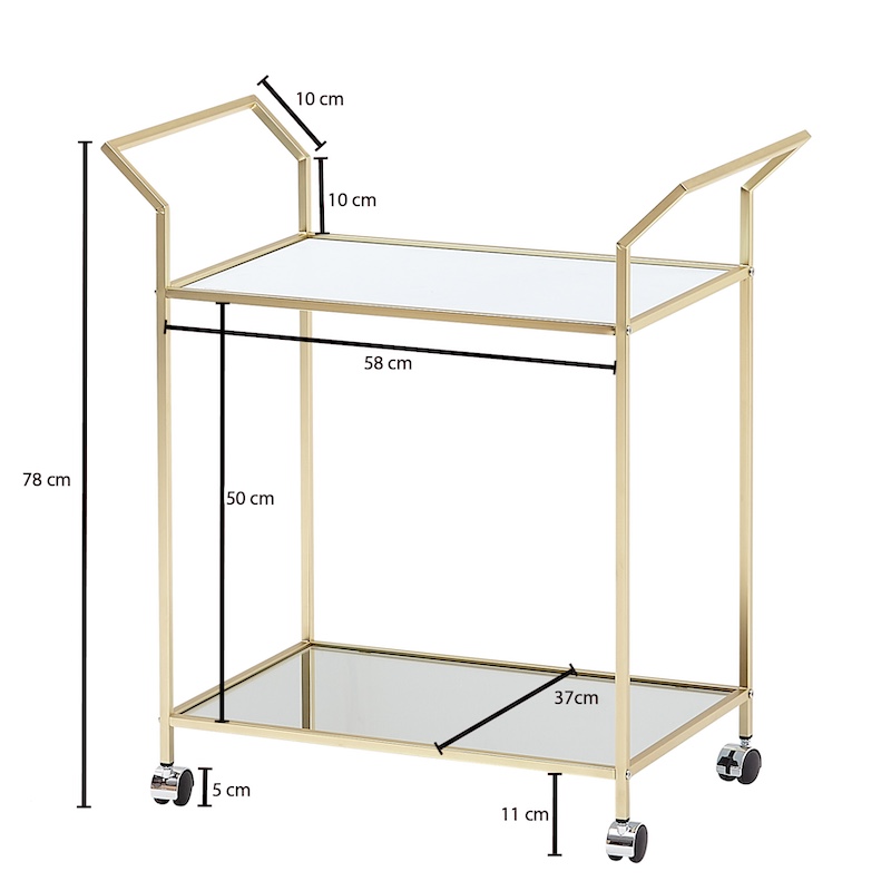 Serveringsbord i messing look med glasplader og låsbare hjul.