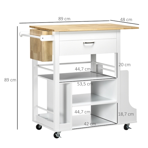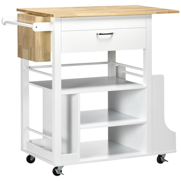 - Krydderihylde, knivholder og håndklædestang på siderne af vognen giver orden og en måde at skubbe vognen på
