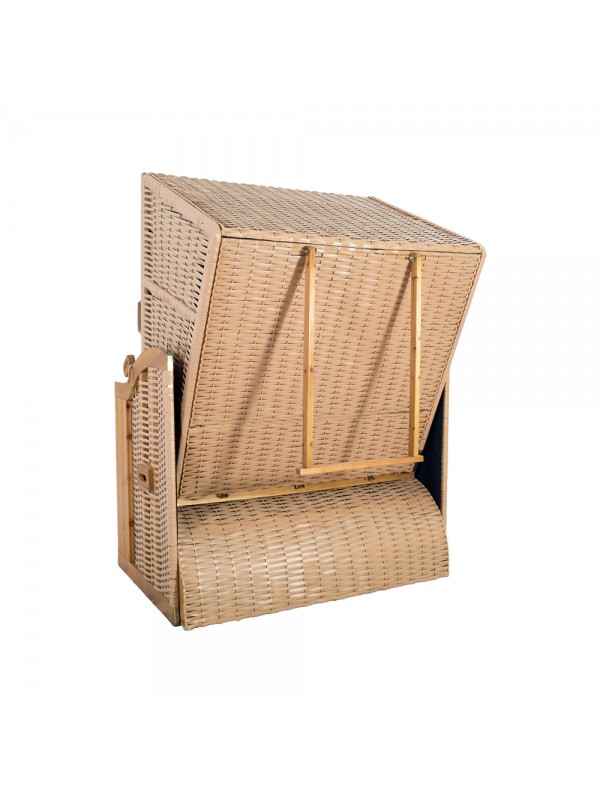Rammen af kurven er lavet af specialbehandlet fyrretræ, som er perfekt til udendørs brug. Polstring og sider af strandstolen er dækket med polyesterstof, og den nedre og øverste kurv er lavet af PE-fladtape.