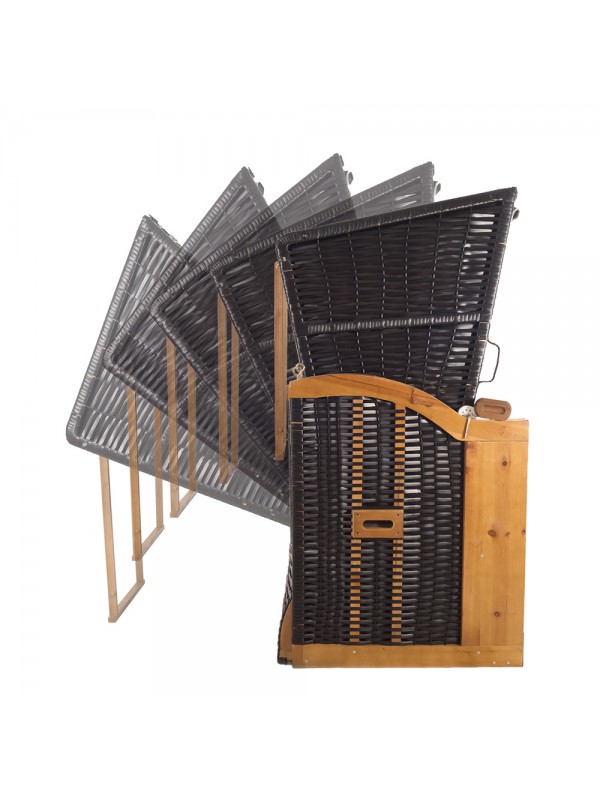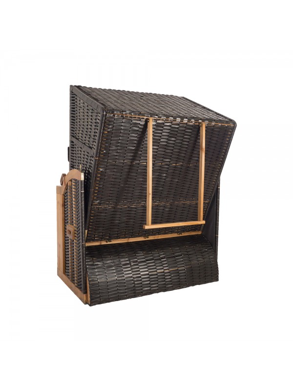 Rammen af kurven er lavet af specialbehandlet fyrretræ, som er perfekt til udendørs brug. Polstring og sider af strandstolen er dækket med polyesterstof, og den nedre og øverste kurv er lavet af PE-fladtape.