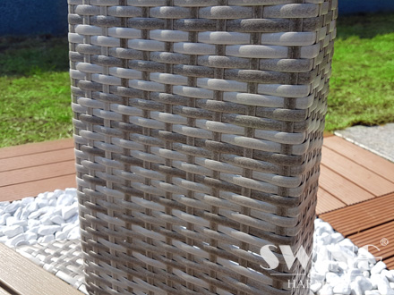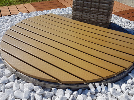 Udtrykket polyrattan er en kombination af polyethylen og rattan. Den letvægts fletning er lavet af en stærkt resistent syntetisk fiber og har, takket være sine positive egenskaber, haft stor popularitet i årevis. I kontrast til konventionel flet, deler polyrattan sig ikke, den er UV-resistent og ekstremt holdbar. Aluminiumsrammen af høj kvalitet er ikke følsom overfor vejr. Plankerne blev lavet af WPC. Disse føles som træ, men har store fordele. WPC splinter ikke, falmer ikke, behøver ikke vedligehold.